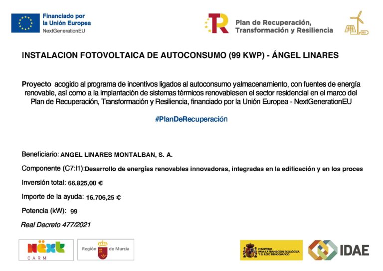 ANGEL LINARES MONTALBAN, S. A. ha recibido una ayuda de la Unión Europea con cargo al FondoNextGenerationEU, en el marco del Plan de Recuperación, Trasformación y Resiliencia, para INSTALACION FOTOVOLTAICA DE AUTOCONSUMO (99 KWP) dentro del programa de incentivos ligados al autoconsumo y almacenamiento, con fuentes de energía renovable, así como la implantación de sistemas térmicos renovables en el sector residencial del Ministerio para la Transición Ecológica y el Reto Demográfico, gestionado por la Región de Murcia, a través de la Dirección General de Industria, Energía y Minas.”